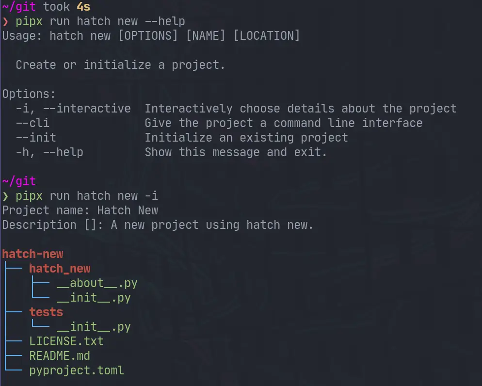 ❯ pipx run hatch new "Another Project" another-project ├── another_project │ ├── __about__.py │ └── __init__.py ├── tests │ └── __init__.py ├── LICENSE.txt ├── README.md └── pyproject.toml