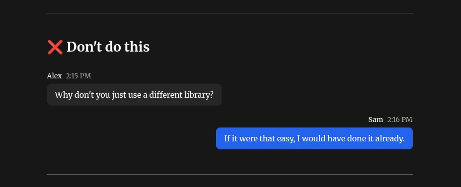 Honestly this example is a little vague and non-specific. On boarding a new library to a team can be a big ask. It becomes something that the team has to integrate and depend on, and take on supply chain risk. This example would be better with something more specific, if the team often uses a mix of SQL, pandas, and occasionally pulls out polars for bigger tasks, Sam might legitimately ask "why don't you just use <insert pandas, polars, SQL>".