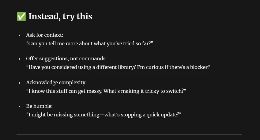 This post is not trying to say that you can freely belittle your team, go forth and be the irritating guy on the team that comes off like a know it all. I'm saying when you are on the receiving end try not to take it with such offense and as an opportunity to explain without the need to dance around the issue.