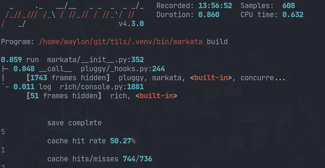 These measurements were taken with pyinstrument mostly out of convenience since there is already a pyinstrument hook built in, but also because I like pyinstrument.