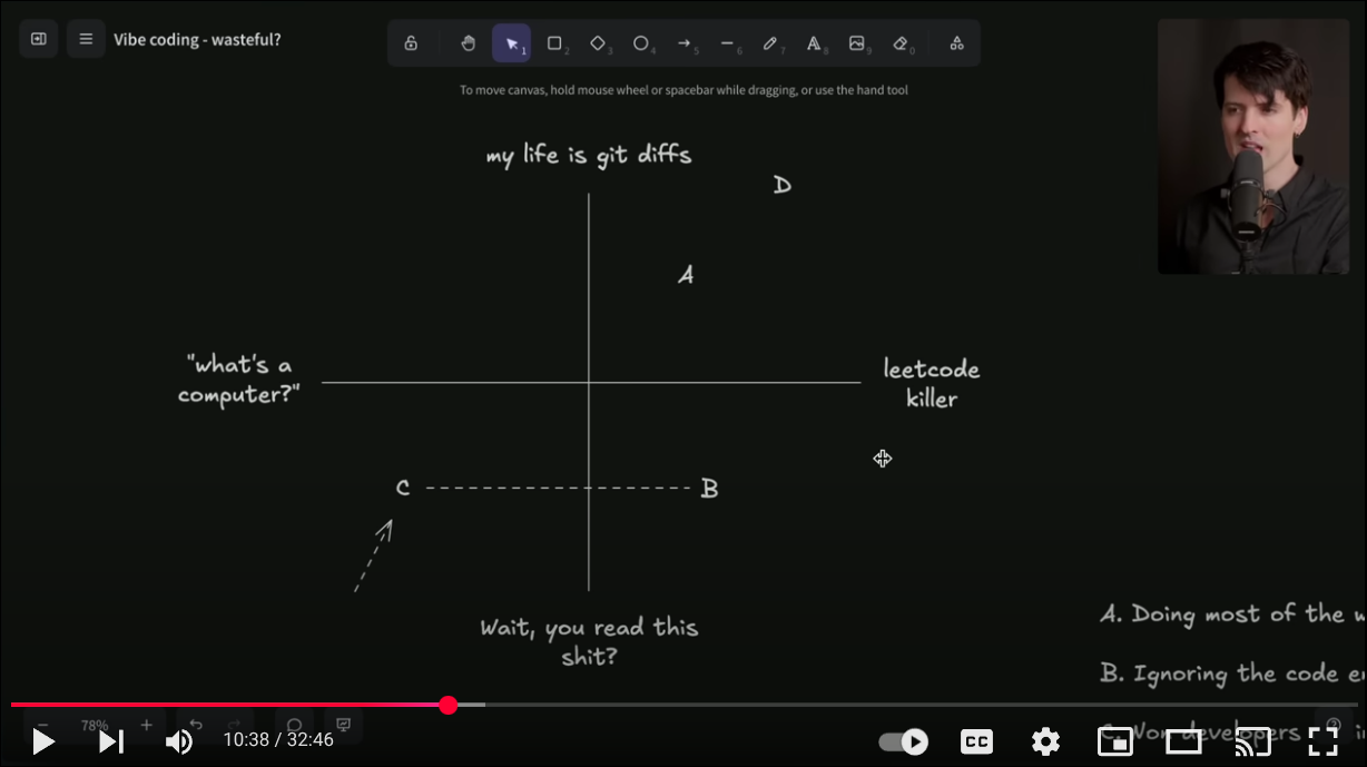 He argues here that its ok to bounce between A,B, and D, but C becomes dangerous. I'd argue that he brought up a 3rd spectrum that is important later on, "how critical is this". I think the I don't know, don't care, didn't read, but the thing did its job is quite fine, but don't know, don't care, mission critical is the main issue we are seeing with agentic coding, primarily in the didn't read but critical Zone.